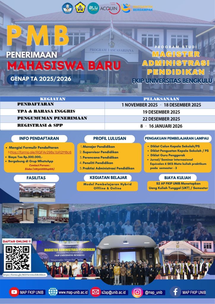 - Profil lulusan dari S2 AP FKIP UNIB ini yaitu : 1) Supervisor Pendidikan; 2) Peneliti Pendidikan; 3) Praktisi Adminstrasi Pendidikan; 4) Manajer Pendidkan; 5) Perencana Pendidikan
